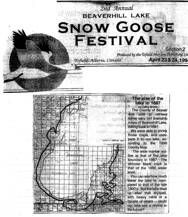 August 29, 2016August 29, 2016Chris Chang-Yen Phillips Snow Goose map comparison Clippings from a newspaper made by the Town of Tofield for the Snow Goose Festival in 1994. The map inset shows how the lake has shrunk by 1990 compared to an old township map from 1887. [City of Edmonton Archives: MS-721 file 79]