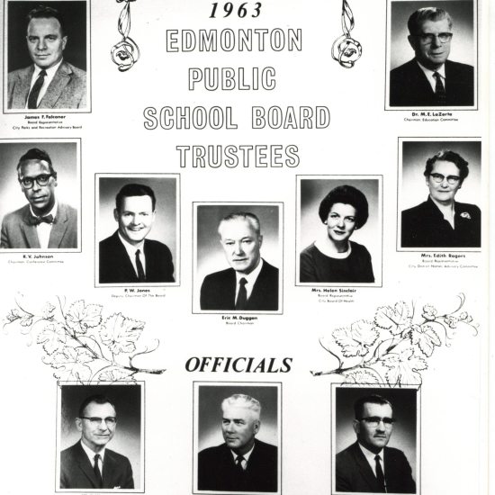 A collection of trustees from the earliest days of Edmonton’s public school board, back in the 1880s and 1890s. Donald Ross (top left) operated the first hotel outside Fort Edmonton, and John A McDougall (second from the left on the bottom) became a mayor of Edmonton, and later an MLA. [EPSB Archives – P85.17.1]Unfortunately, searching through pictures was inconclusive. As you can see by R V Johnson’s photos over the years, what looks like dark skin could just be dark photocopying. We decided to try other methods of research.