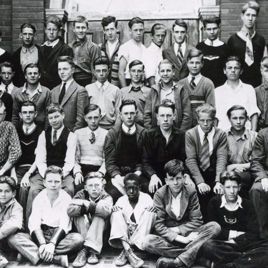 A class photo from the 1932 Grade 8 class at Edmonton Technical School. Based on an entry in the school’s yearbook that that reads “Stanley Petherbridge was walking down the street with the Birth of a Nation behind him,” we initially believed the black student in the centre of the bottom row was named Stanley Petherbridge.