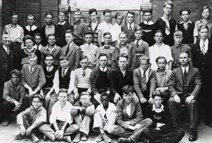 A class photo from the 1932 Grade 8 class at Edmonton Technical School. Based on an entry in the school’s yearbook that that reads “Stanley Petherbridge was walking down the street with the Birth of a Nation behind him,” we initially believed the black student in the centre of the bottom row was named Stanley Petherbridge.