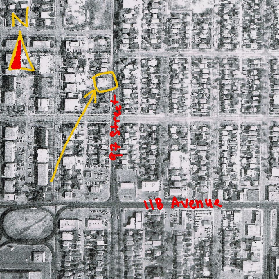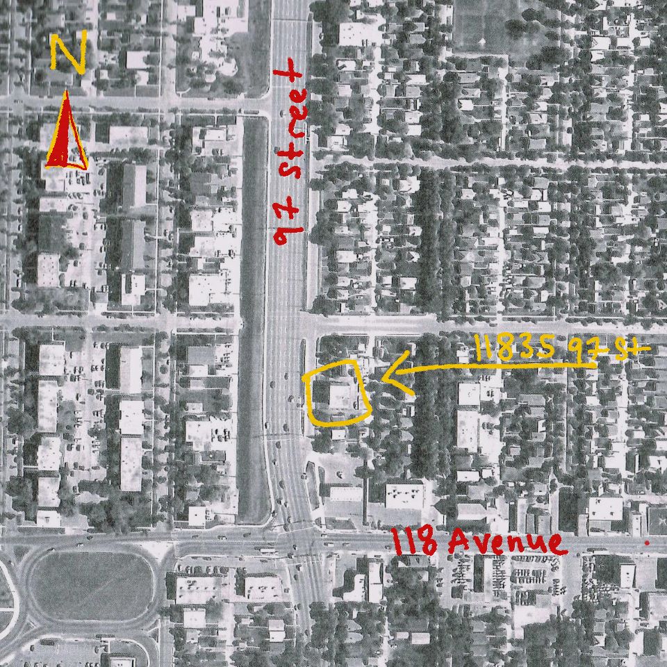 - Aerial photograph of the area in 1984, showing the building at 11835 97 Street (North West Survey Corporation International Ltd.)