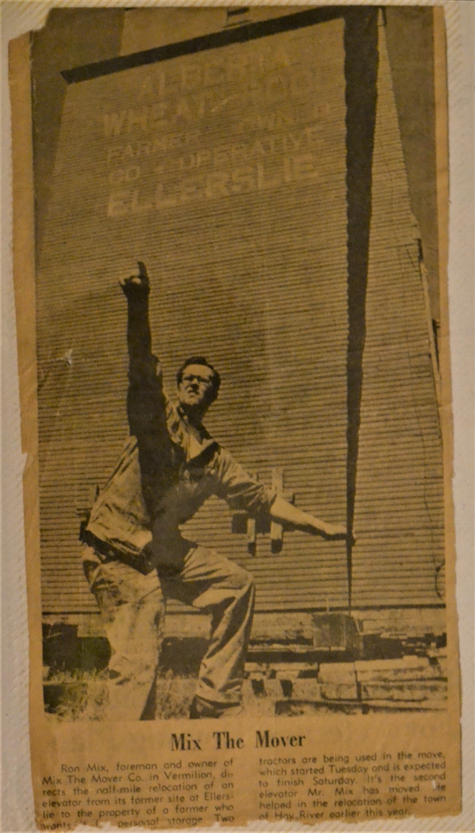 - A newspaper clipping of Mix the Mover taking a grain elevator down the highway