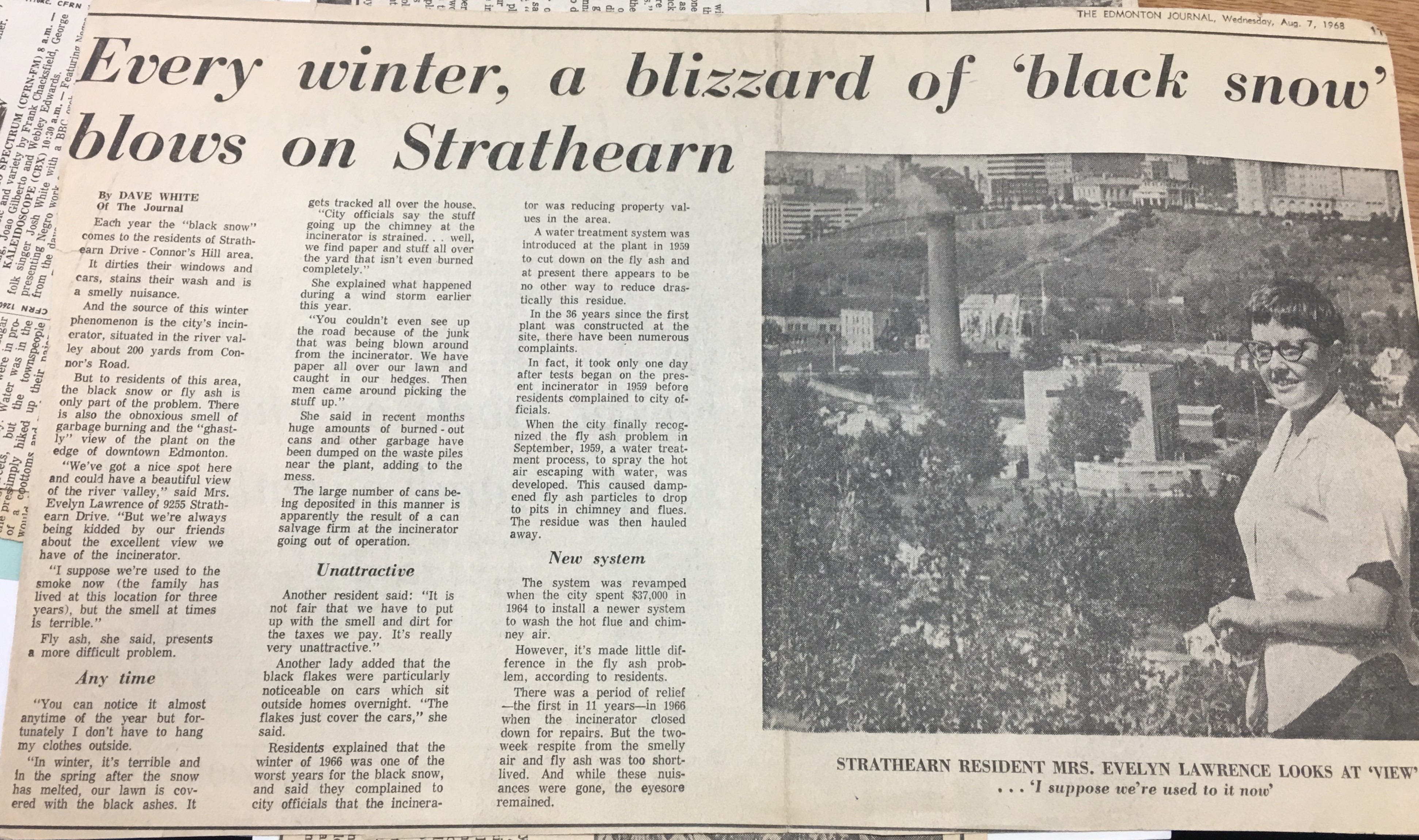 - “Every winter, a blizzard of ‘black snow’ blows onto Strathearn” – Edmonton Journal, August 7, 1968