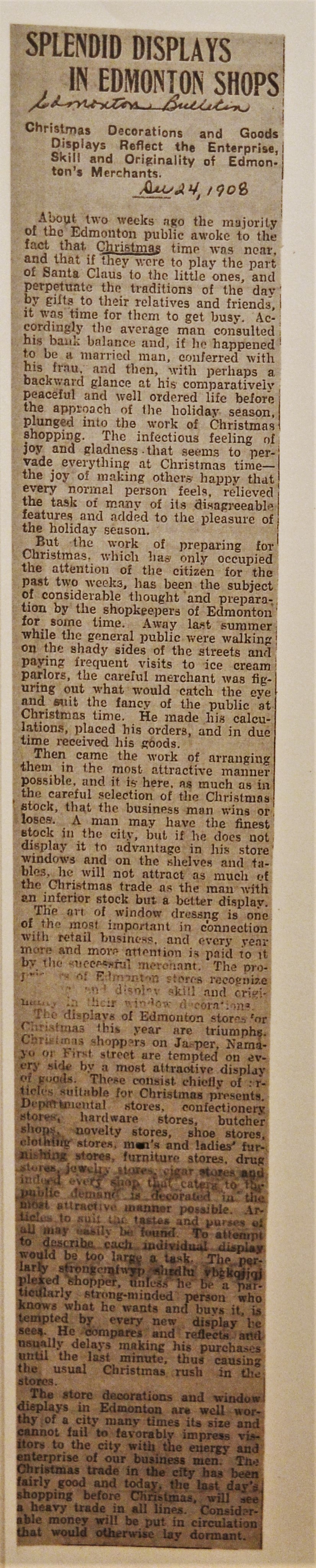 We found a hilarious article from the Edmonton Bulletin on Christmas Eve, 1908, where the writer seems to have fallen asleep near the end.