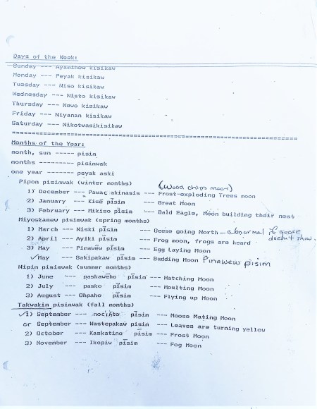 Norma shared an instructional sheet she uses to teach the months in Plains Cree.