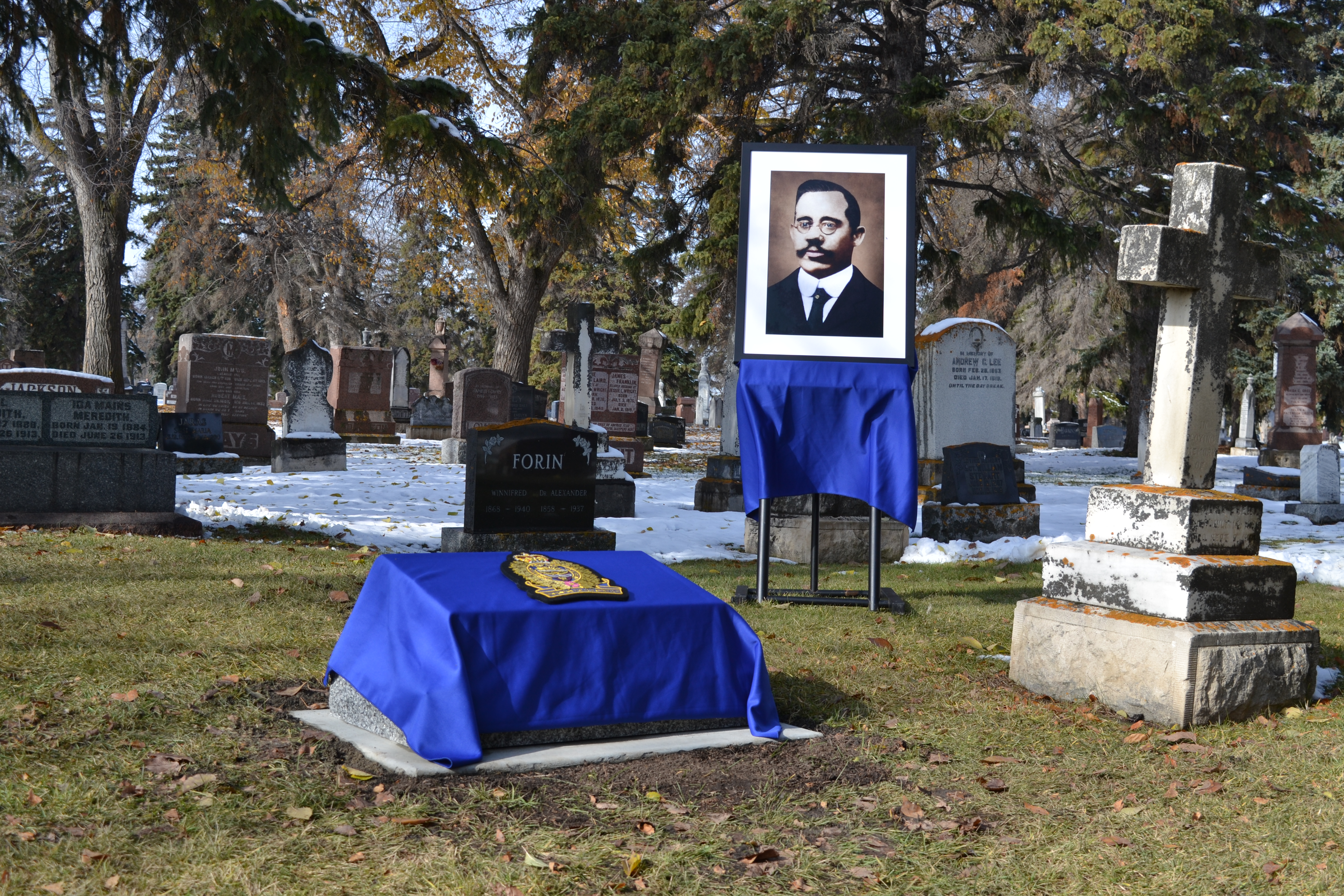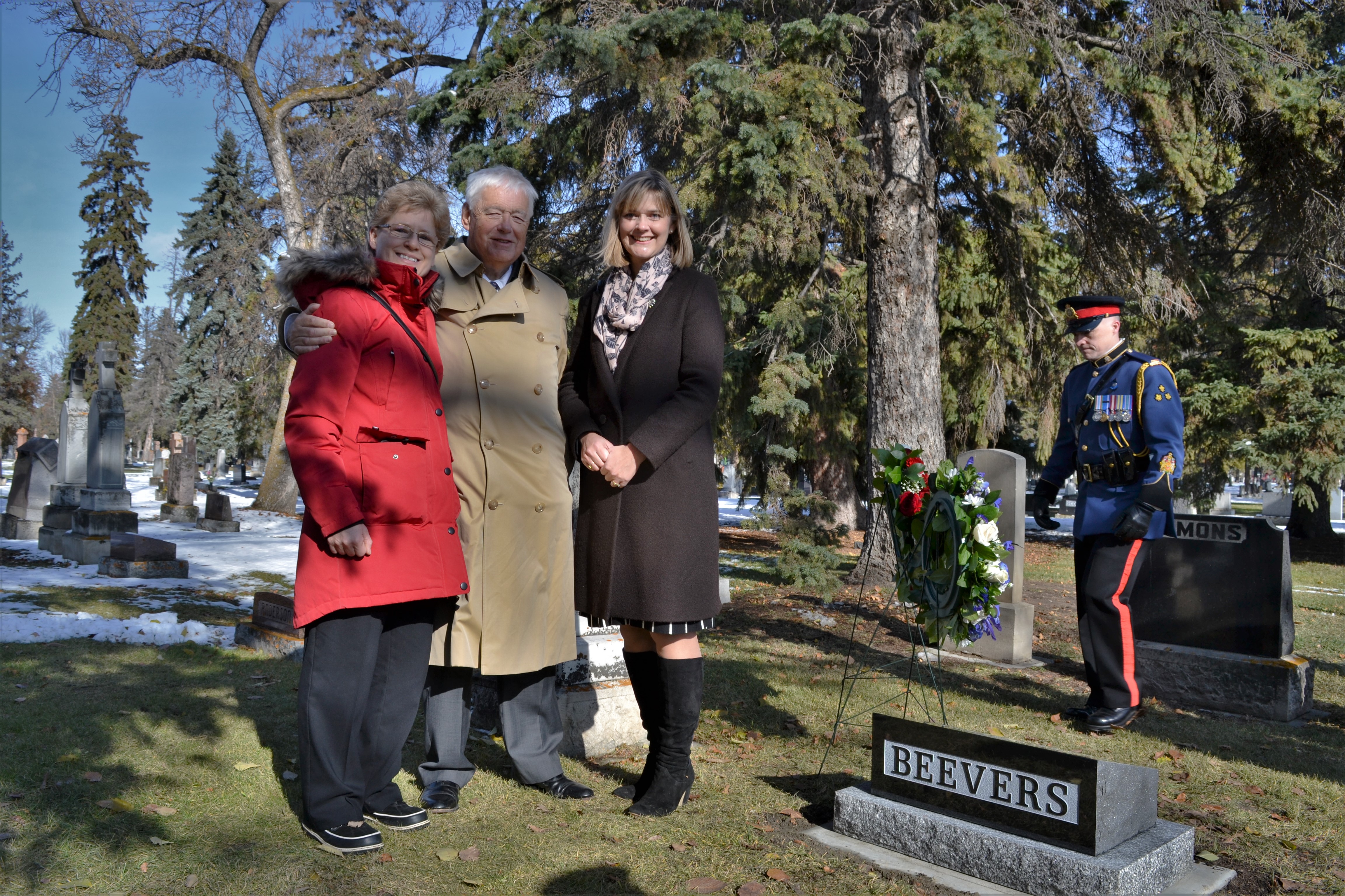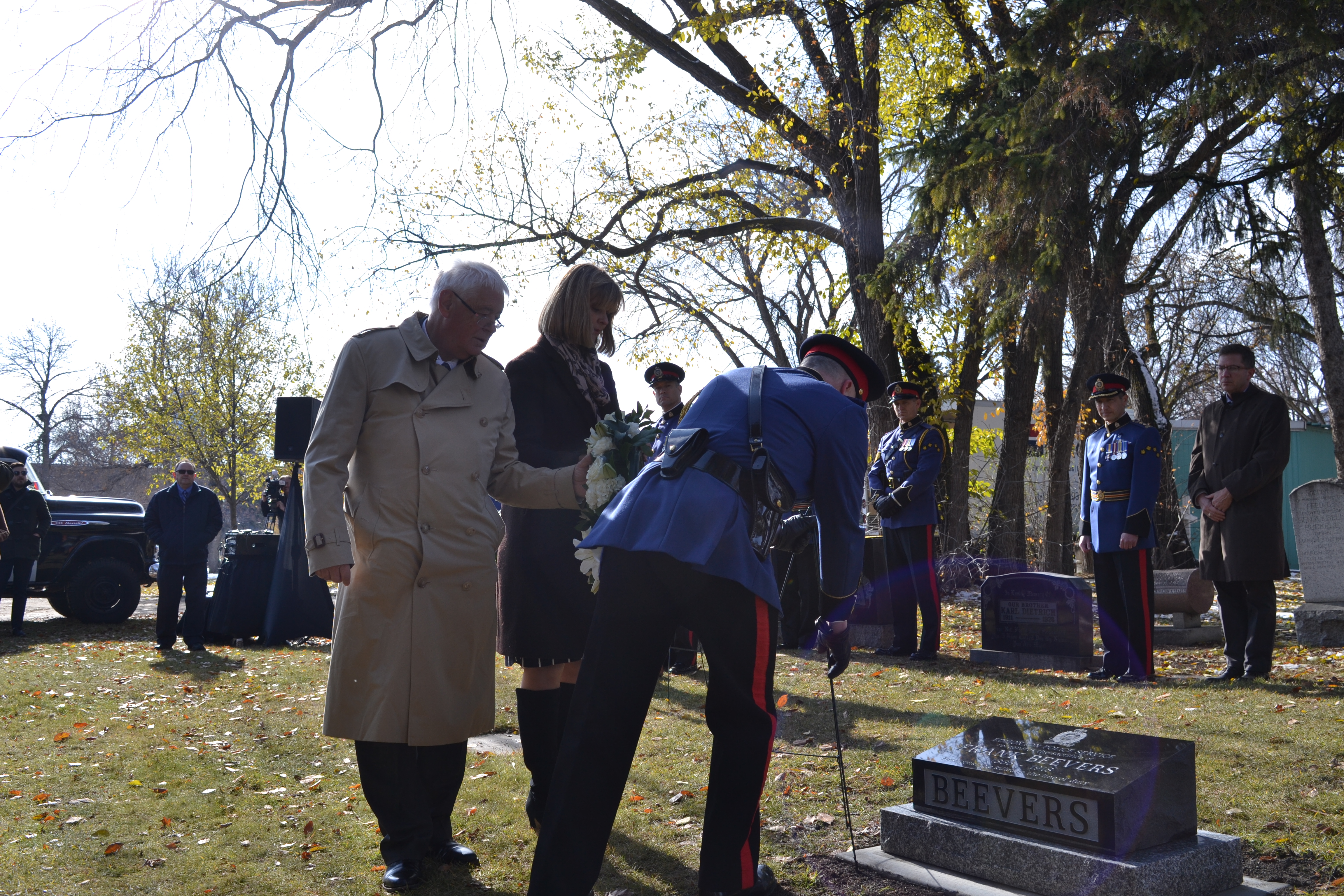 Frank Beevers’ touched-up portrait beside his new gravestone, covered by a blue cloth and the Edmonton Police Service logo.Graham Beevers was among the speakers who said a few words before the unveiling of the gravestone.Graham Beevers and Candy Johnson laying a wreath at their ancestor’s new gravestone.