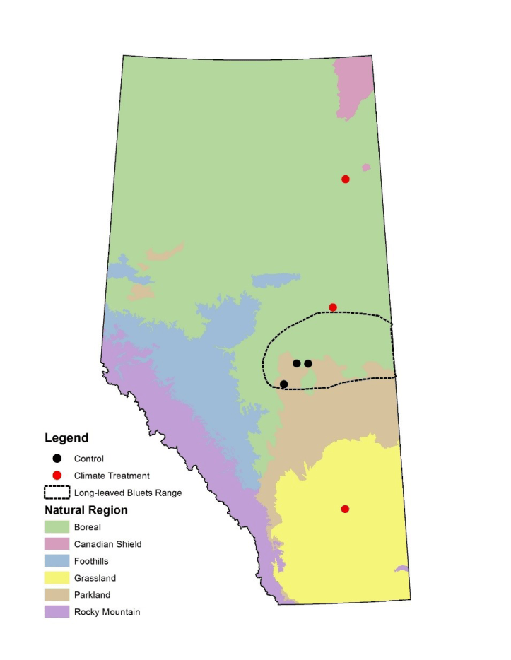 September 20, 2019September 20, 2019Chris Chang-Yen Phillips Map of Alberta indicating the geographical locations of Houstonia longifolia translocation sites Map of Alberta indicating the geographical locations of long-leaved bluet translocation sites [from Jennine Pedersen’s paper]