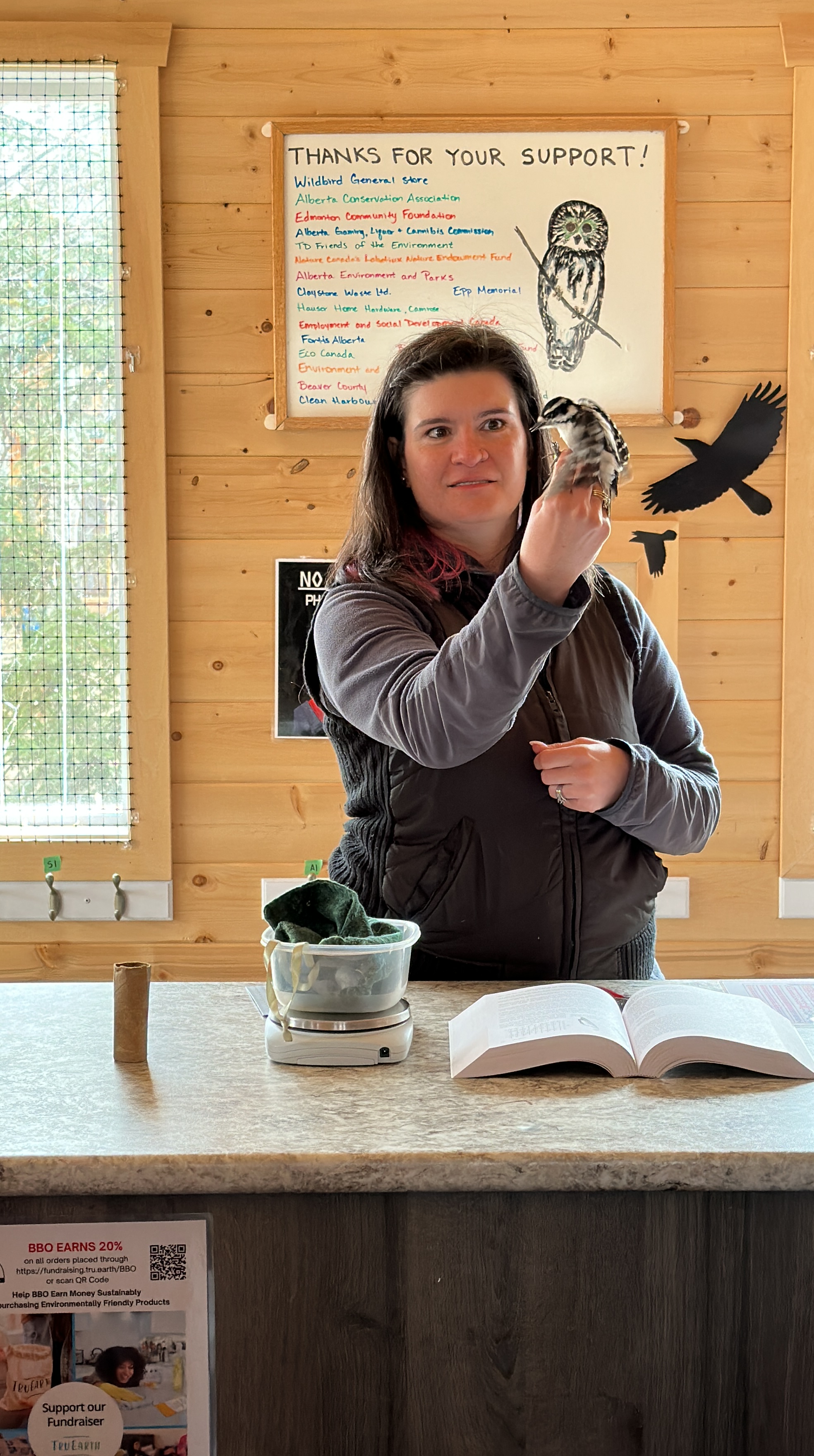 Our host Chris took one of the Snow Goose Festival bus tours out to the Beaverhill Bird Observatory, where biologists demonstrated how to band a small downy woodpecker.