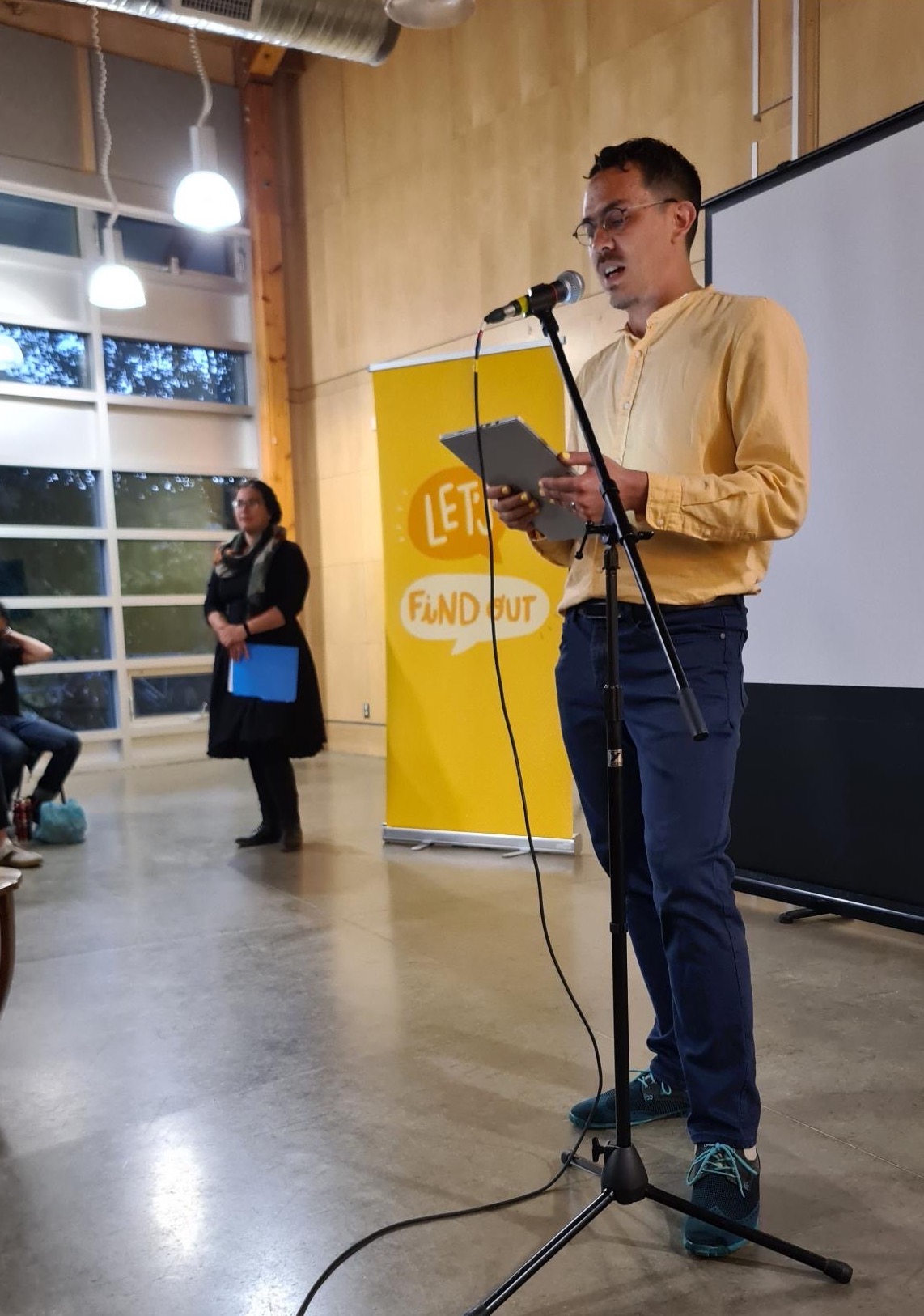 Chris Chang-Yen Phillips stands in front of a microphone, with the Let's Find Out banner and Lauren Markewicz behind him.