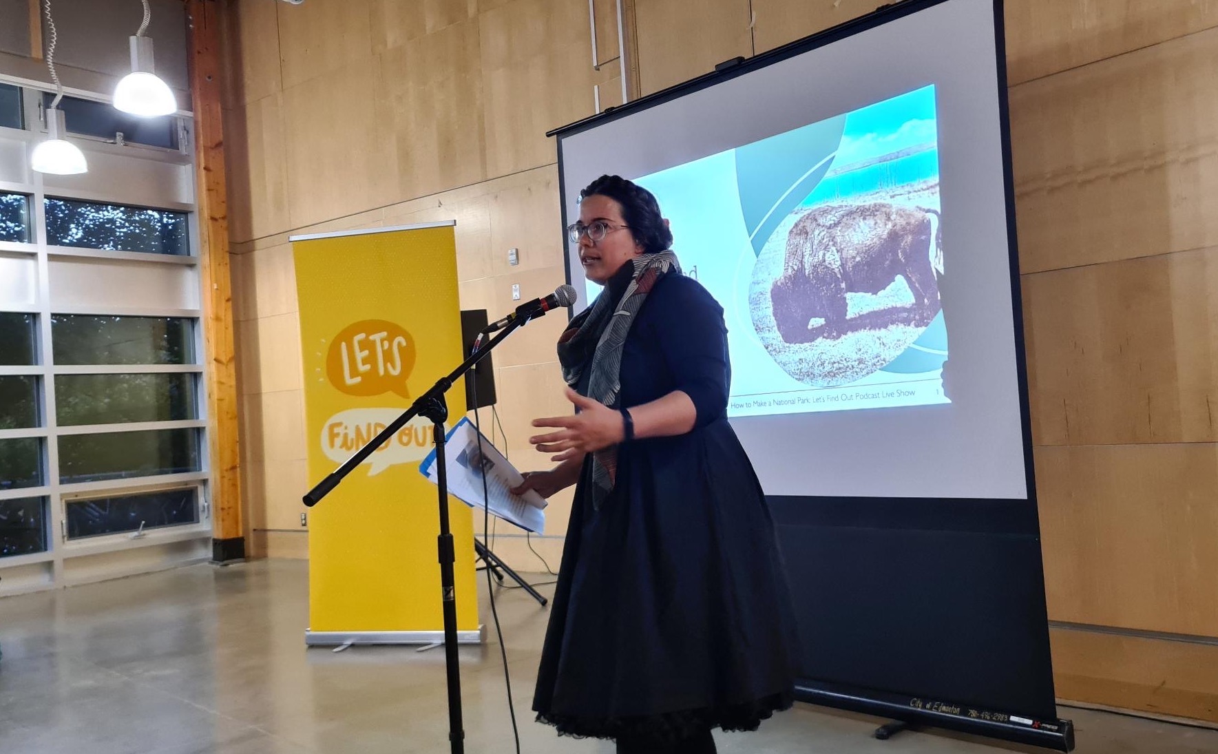 Speaker Lauren Markewicz talks at a microphone. Behind her are the Let's Find Out banner and a projected image of bison.