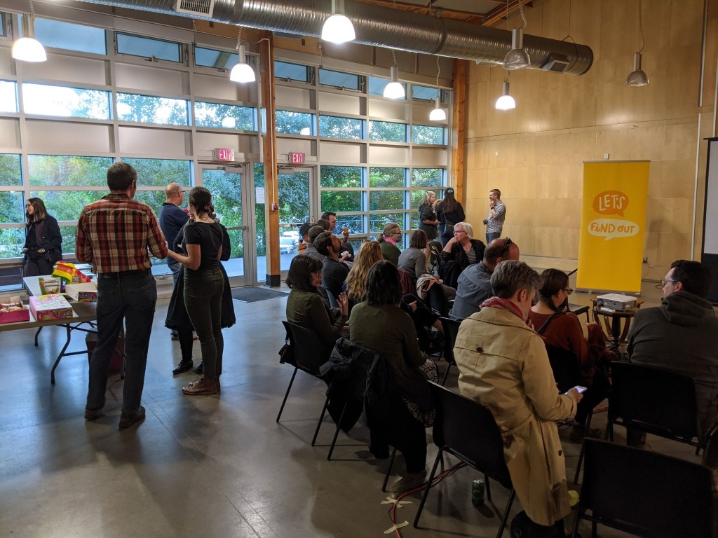 Audience members clap, seated, for speakers Chris Chang-Yen Phillips, Mack Male, Miranda Jimmy, and Lauren Markewicz.